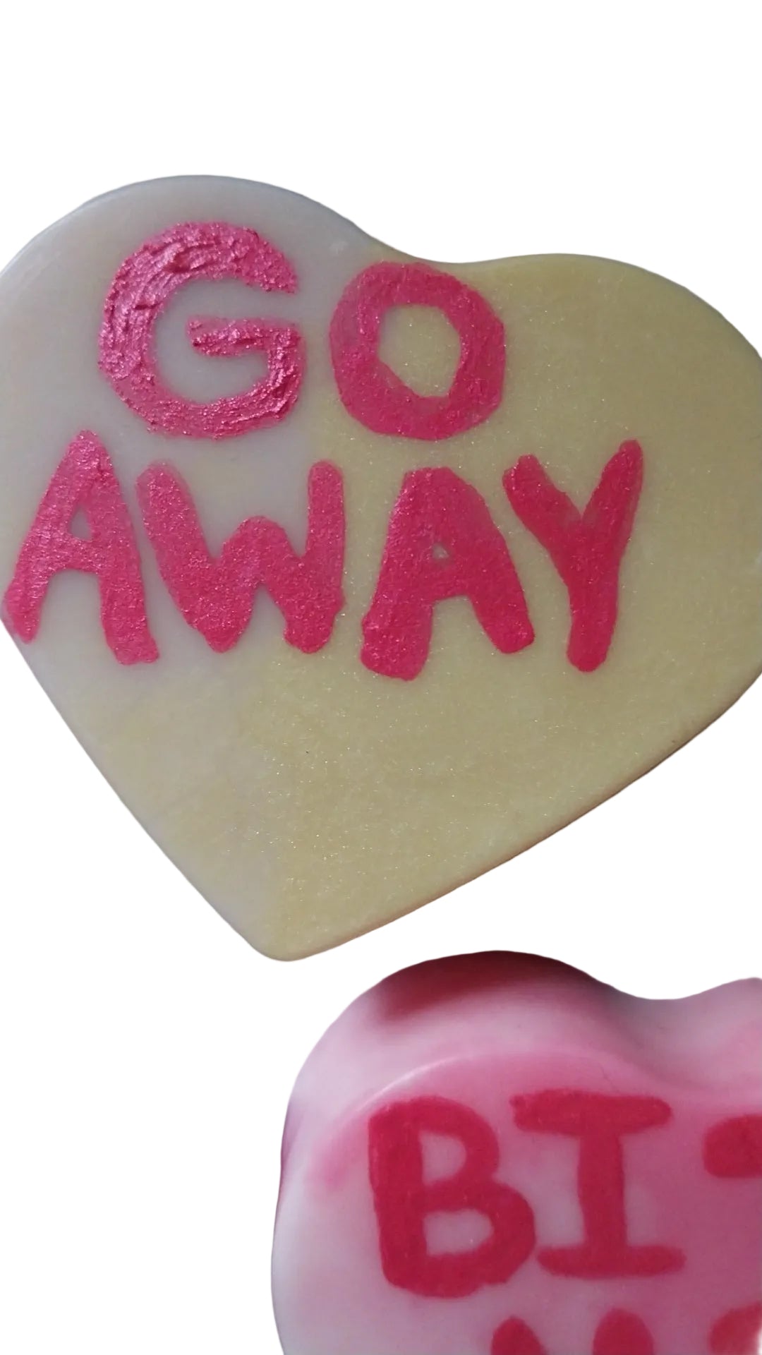 hand made soaps inspired by conversation hearts. Fragrance oils, and mica. Phthalates free fragrance oil. Brand new scents! These come in sets of 4 in a brown craft gift box with heart shape window. These make the perfect Heart Shaped Box Soap Gift Boxes.