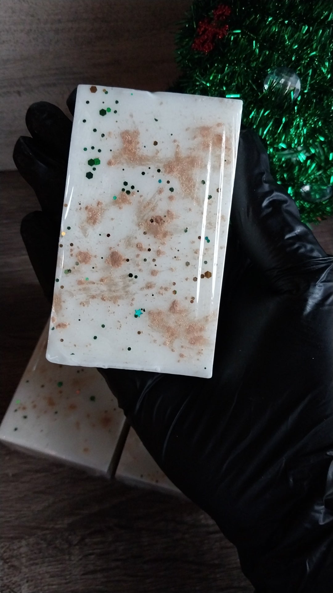 These adorable festive glitter soaps beauty bars are lightly dusted with cosmetics glitter and mica. Just a sprinkle on the top for some festive fun!
